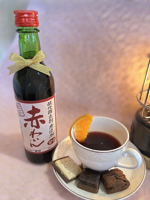 1. 無添加赤わいんを耐熱グラスに注ぎ、電子レンジ500Wで約30秒温める